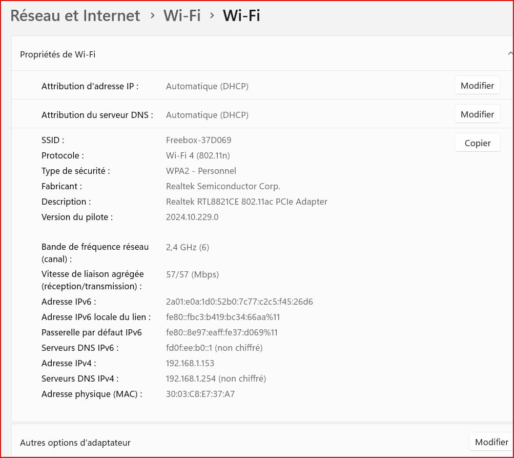 je me demande pourquoi le PC se connecte en wifi N et 2,4 Ghz, la plus mauvaise configuration possible au niveau performances sur une box capable de wifi 6, voire 7.