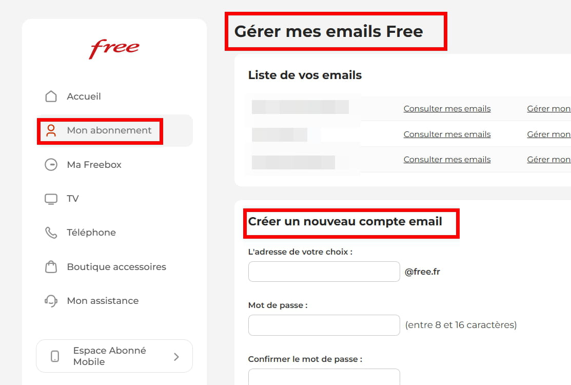 Ensuite : Mon abonnement > Gérer mes emails Free