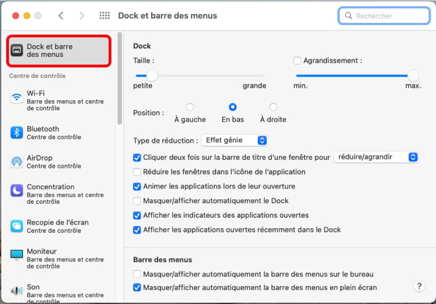 Si tu passes par le menu Pomme > "Préférences système" > "Dock et barre des menus", qu'observes-tu ?