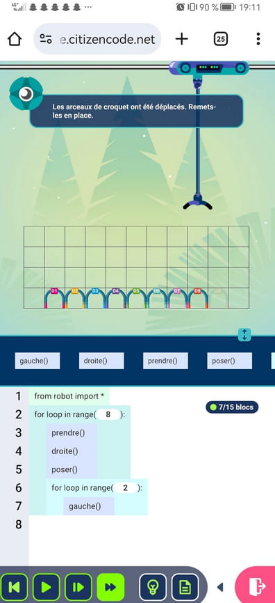 Première chose, en partant avec la pince en position 1, il faut aller à droite, 8 fois, pour être au dessus de l’arceau 8. Puis il faut définir toutes les manipulations pour, prendre l'arceau, le déplacer à droite, le poser, et enfin se déplacer vers la gauche, 2 fois, pour se retrouver au dessus de l'arceau n-1 (la première fois le 7). Tu devrais alors avoir les instructions pour créer une séquence à exécuter 8 fois pour les 8 arceaux.
