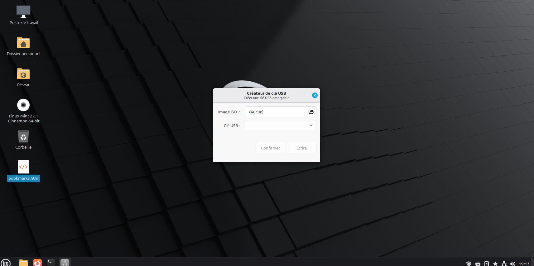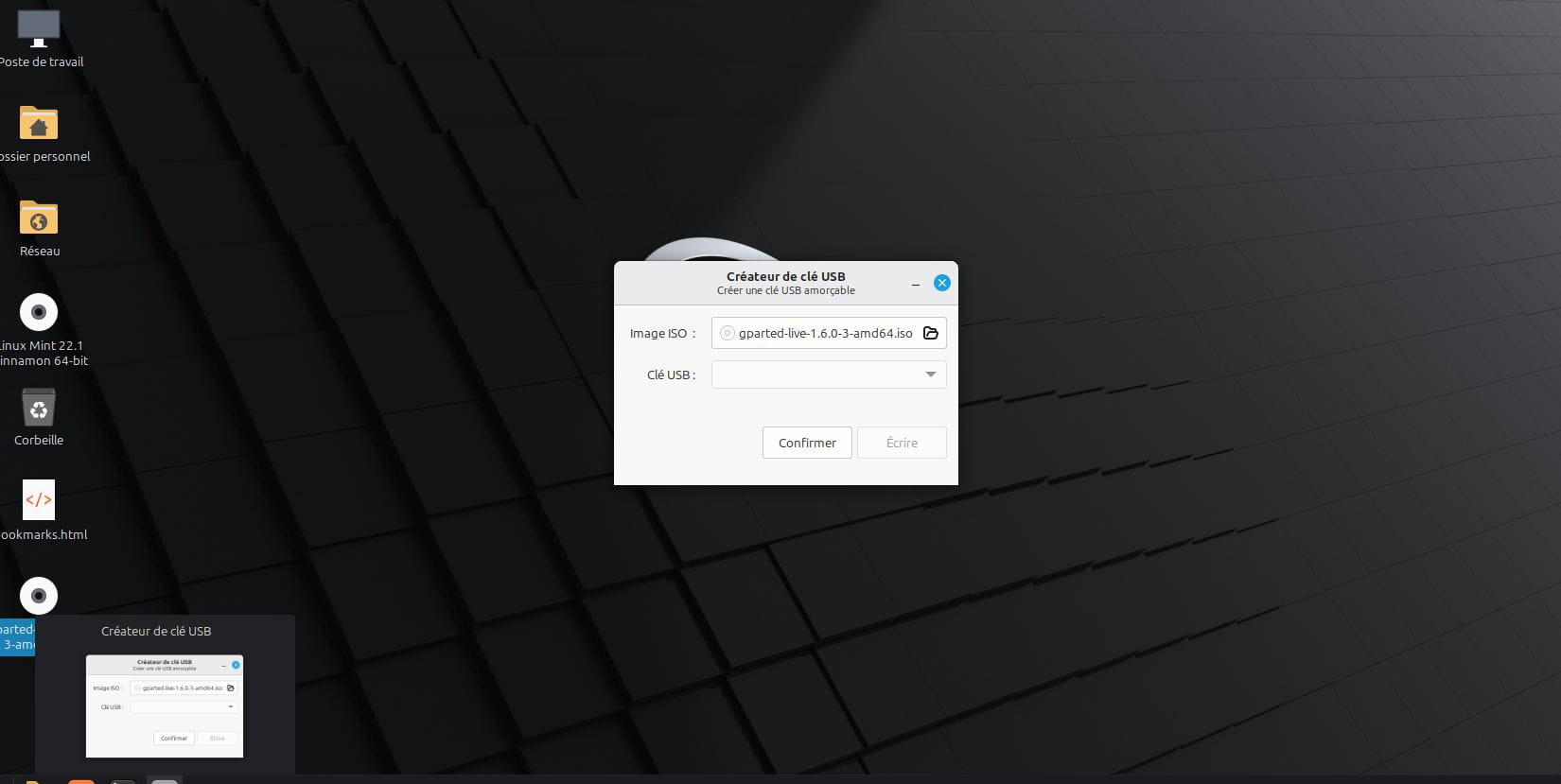 on obtient un fichier ISO sur le bureau, une fois le téléchargement terminé, vérifier que la clé USB est bien connectée, déconnecter par sécurité toutes les autres clés USB de stockage.