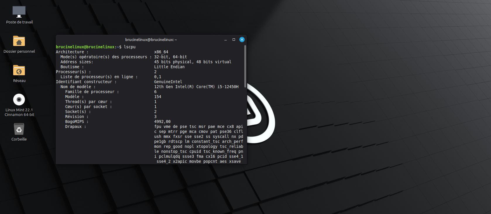 Lancer le terminal (petite icône noire de la barre des tâches), saisir lscpu, noter si les deux premières lignes parlent de 64