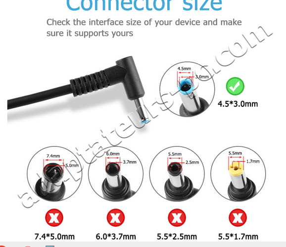 Le chargeur est bien un HP mais un petit diaporama sur le site du vendeur précise les diamètres des embouts ==> en vert :4.5mm extérieur /intérieur 3mm.