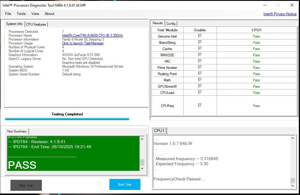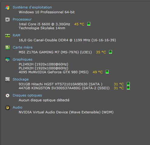 Voici en pièce jointes deux photos de ma configuration et d'un test Intel sur mon processeur