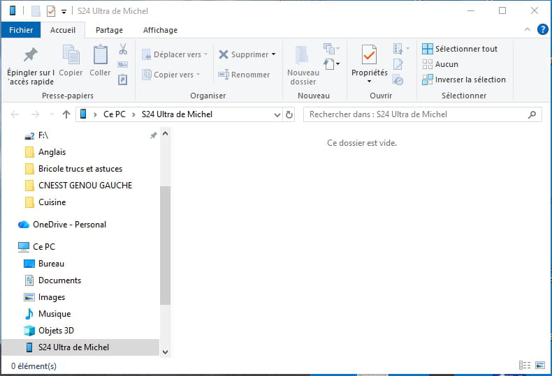 Je n'arrive plus à transférer mes photos de mon cell à mon ordi. J'utilise toujours le même fil. J'ai essayé un autre fil et rien à faire. Une fenêtre s'ouvre mais indique DOSSIER EST VIDE.