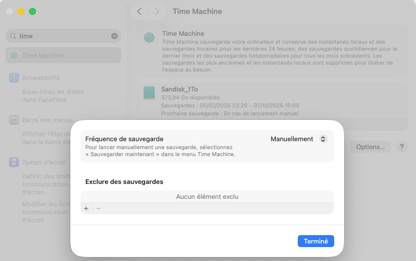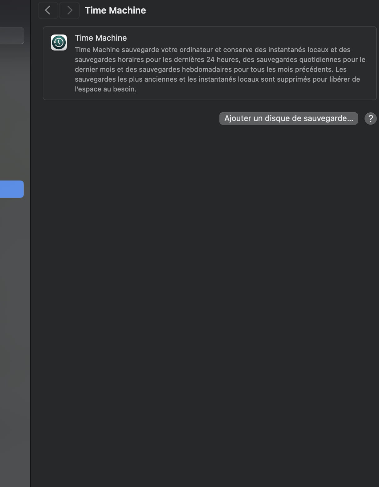 Pour Time Machine, tu vas dans les Réglages système, et tu vois si tu as ou non choisi un disque dédié à Time Machine, et si c'est le cas, tu peux le supprimer, ou en ajouter, de la même manière tu peux décider si les sauvegardes sont automatique ou manuellement, exemple :
