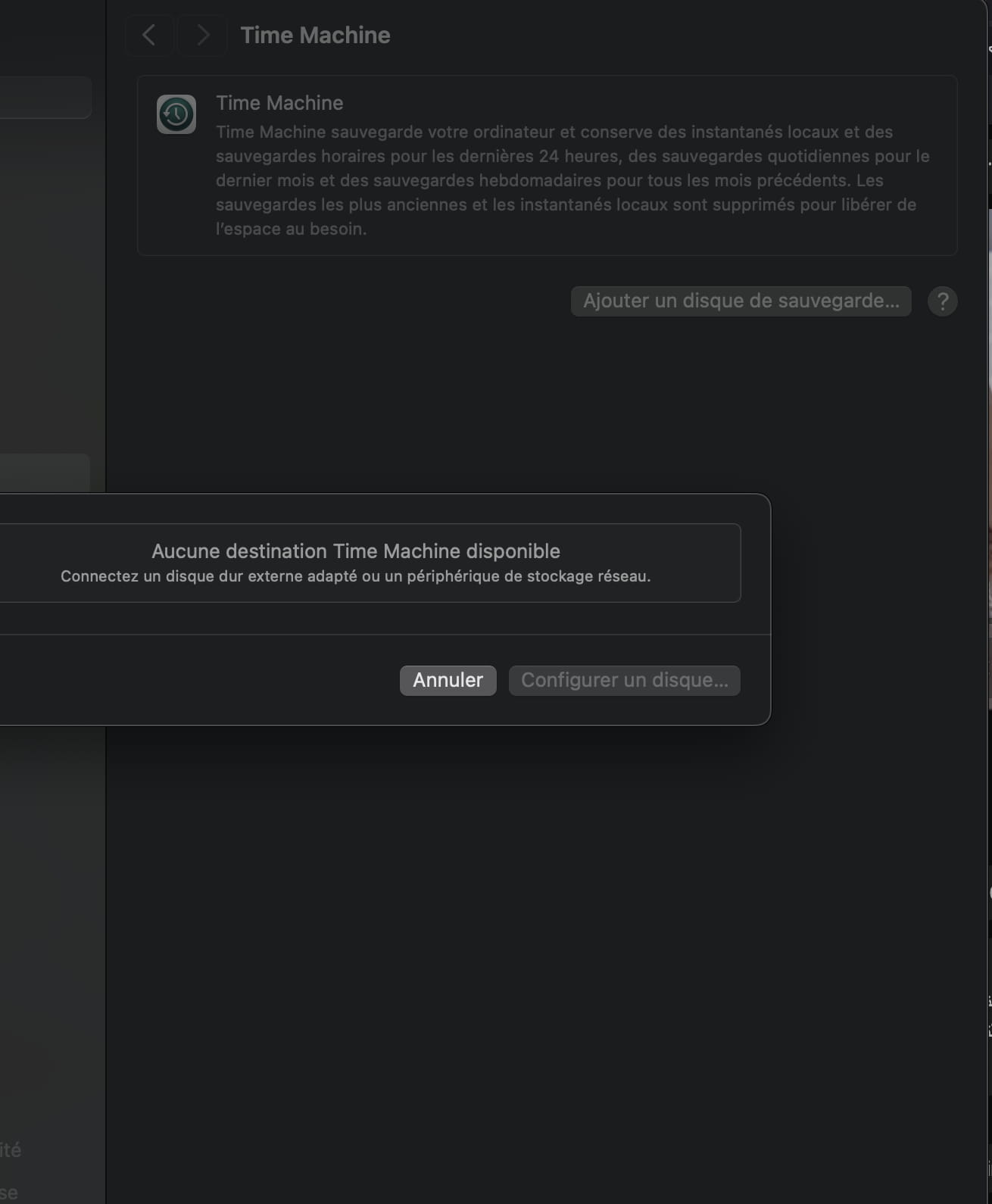 Quand à tes copies d'écran, elles sembles liées à l'application Time Machine. Si la saturation est due à Time Machine, c'est que Time Machine a été paramètrée pour faire des sauvegardes automatiques à fréquence régulière, donc en principe toutes les heures... mais si aucun disque dédié à Time Machine n'est connecté, ces fameuses sauvegardes se font de manière automatique et temporaire sur ton disque interne de démarrage... (disque interne ou SSD interne, c'est selon le Mac et sa configuration)... en ce cas, il faut connecter le disque dédié à Time Machine pour que le système puisse y déverser ses sauvegardes temporaires , les fameux instantanés locaux, sur le disque dédié. Ou sinon, désactiver les sauvegardes Time Machine automatiques, pour ne les lancer que manuellement, lorsque le disque externe, ou SSD externe, est connecté au Mac.