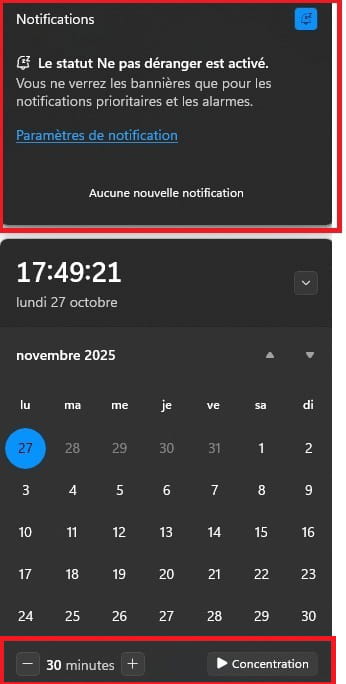 J’ai installé Windows 11 Pro, mais je cherche un moyen de désactiver le bloc de notifications (pas les notifications elles-mêmes) et la zone de concentration, dont je n'ai pas l'utilité.