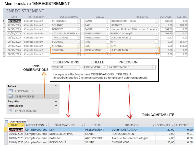J'ai un formulaire et voudrais qu'en remplissant le champ "Observations", les 2 champs suivant se remplissent tout seuls, ceci dans ma table "Comptabilité".