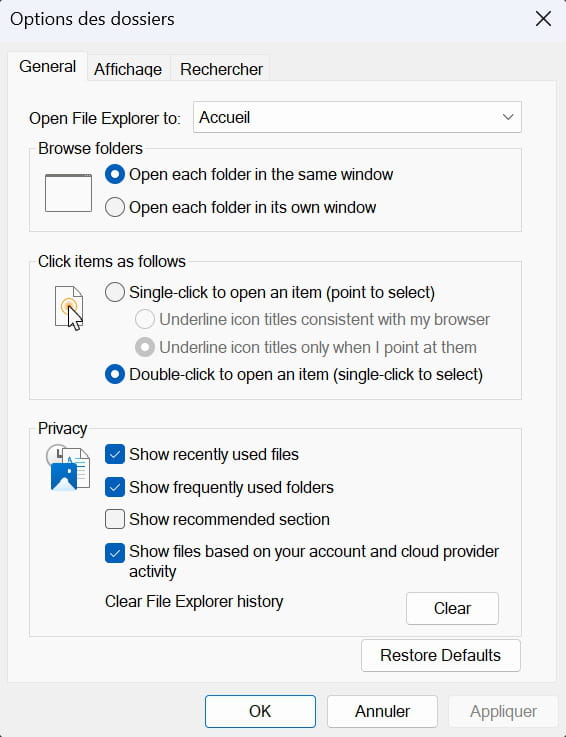 Perso j'ai abandonné l'idée qu'ils savaient faire les traductions, surtout depuis que l'IA "corrige" il me semble qu'on a régressé. Aujourd'hui en passant par options des dossiers j'ai ta page entièrement en français, un autre menu une ligne "scan with" toute seule en anglais aussi. La dernière mise à jour c'était mieux traduit.