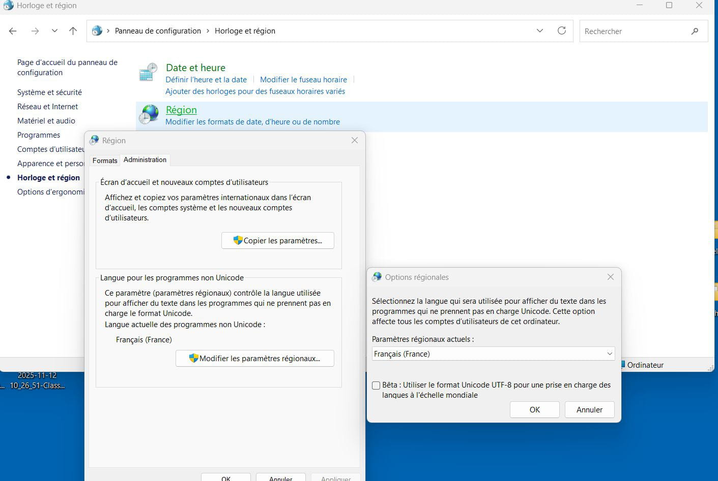 Il existe aussi dans Panneau de Configuration, Horloge et région, Région, Administration, Modifier les paramètres régionaux un paramètre de modification de la langue dans les programmes ne prenant pas en charge Unicode.