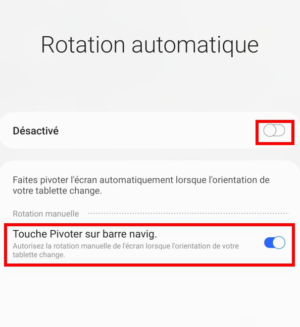 Personnellement c'est ainsi que j'utilise ma tablette : "Rotation automatique" désactivée et "Touche Pivoter" activée.