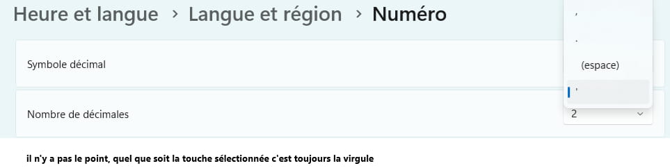 "Panneau de config / Région / Parametres supplémentaires" (Symbole decimal)