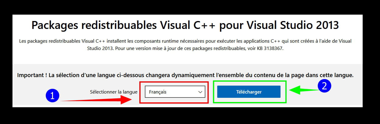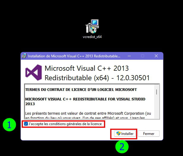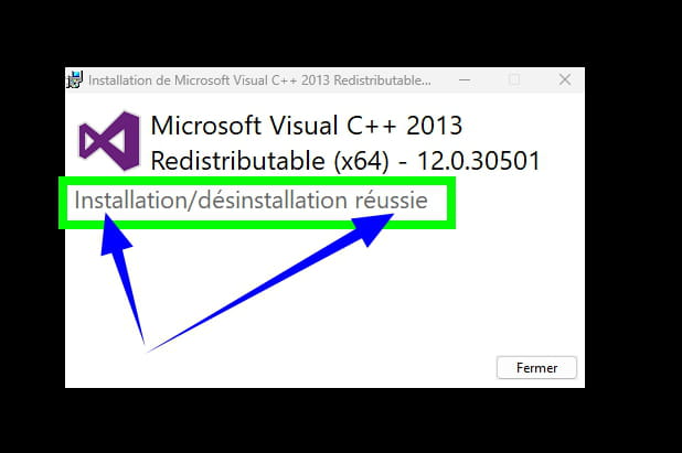 Cela va demander d'installer la package Visual C++ pour Visual Studio 2013 si ce dernier n'est pas installé sur le PC.(continuer l'installation si pas de message demandé).
