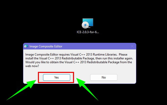 Image Composite Editor nécessite les bibliothèques d'exécution Visual C++ 2013. Pour télécharger les packages redistribuables, exécutez à nouveau ce programme d'installation. Souhaitez-vous obtenir les packages redistribuables Visual C++ 2013 sur le Web dès maintenant ?