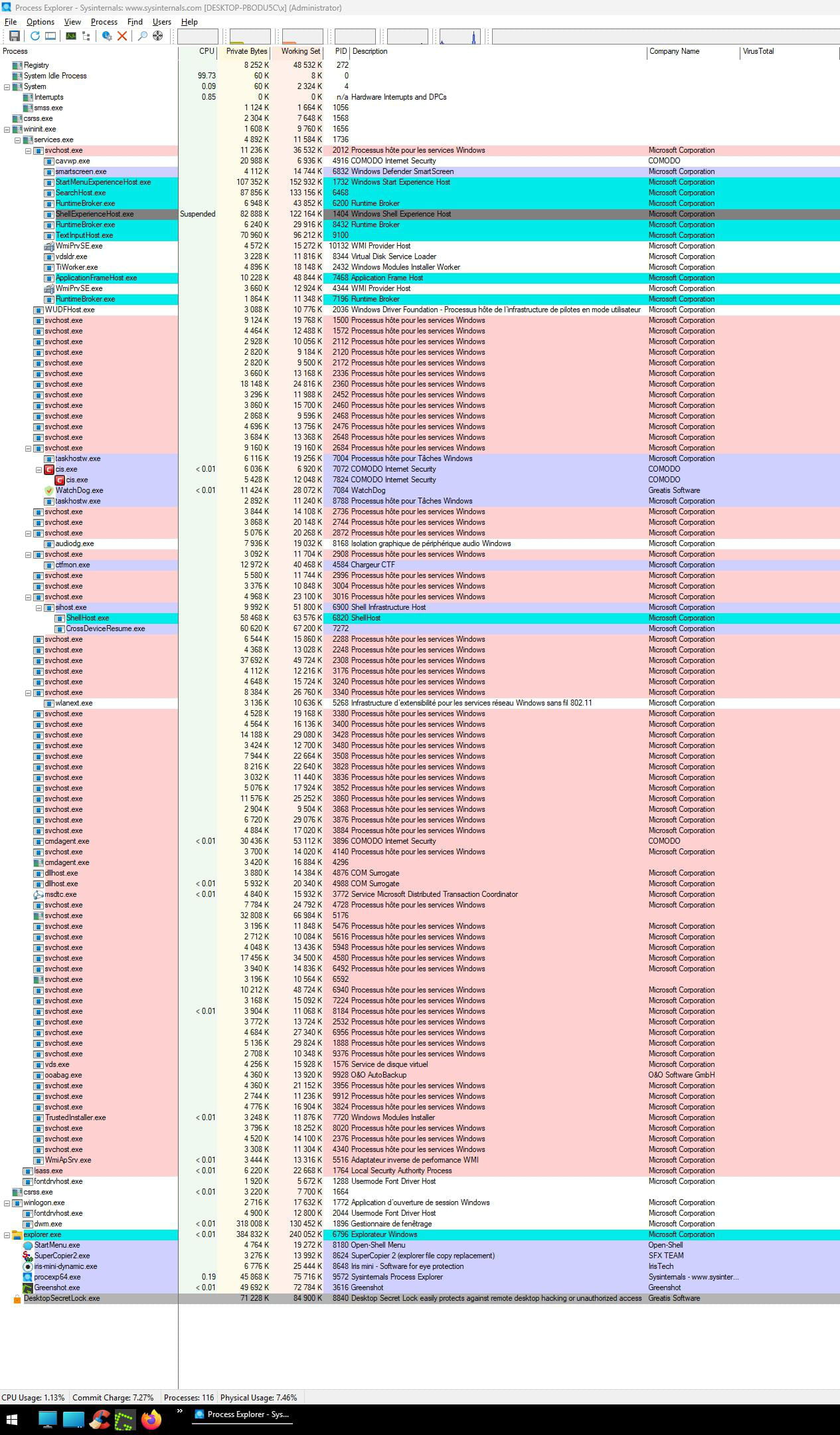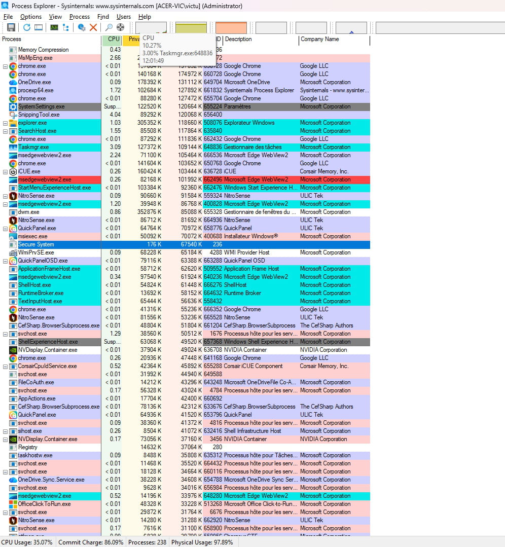merci pour votre réponse. J'ai installé Process Explorer et l'ai donc lancé en administrateur, mais il n'y a rien que je remarque qui m'inquiète, les 3/4 des services ouverts sont du microsoft, le reste c'est windows defender ou les application qui sont ouverte en arrière plan. J'ai pris une capture d'écran, au cas où, et j'ai trié dans ce qui consomme le plus de ram.