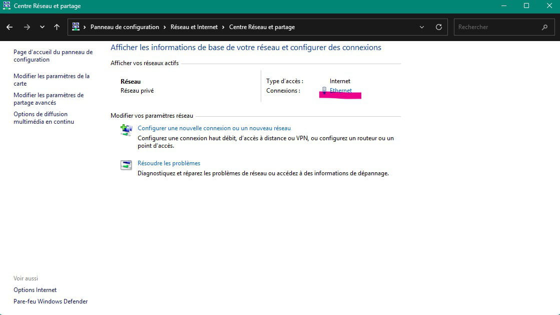 Il faut aller dans le Panneau de configuration > Centre réseau et partage > Modifier les paramètres de la carte (À gauche)