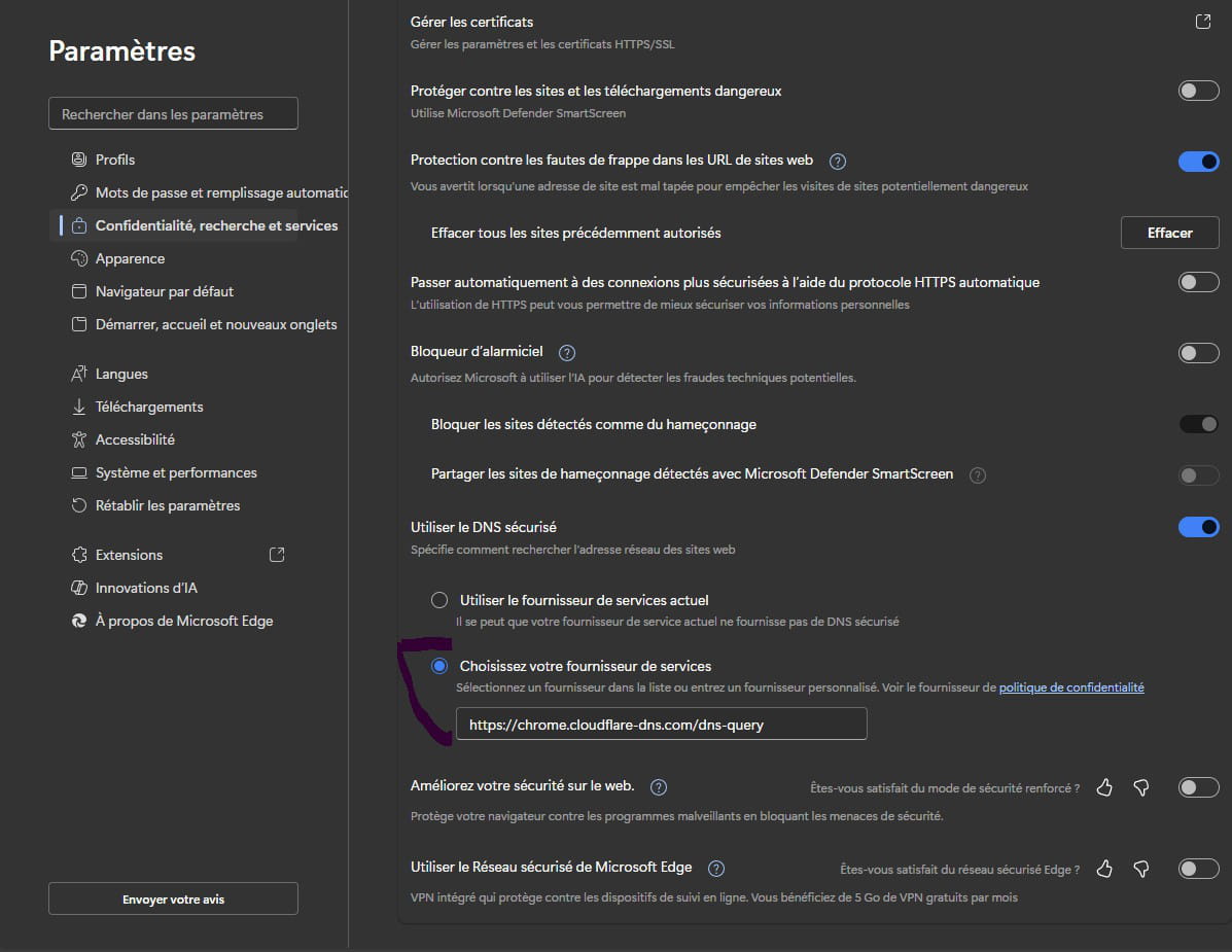 Ensuite dans les paramètres sécurité de votre navigateur, choisir Cloudflare