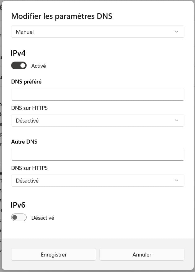 7-Remplir le formulaire avec les DNS choisis pour IPV4 et éventuellement IPV6