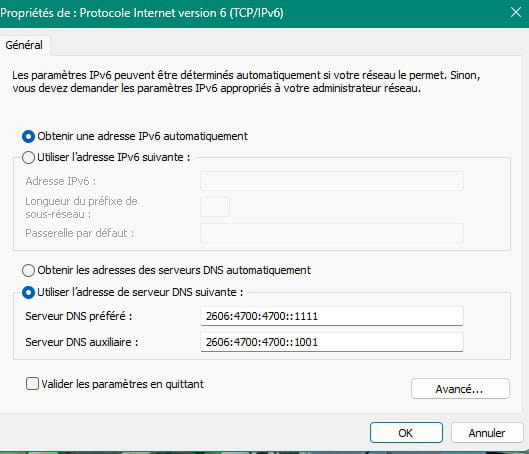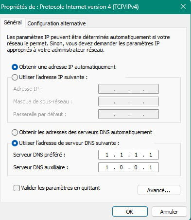 À Utiliser l'adresse DNS Suivante , il y a Préférée, et Auxiliaire, il faut indiquer les deux, moi c'est Google, 8.8.8.8 et 8.8.4.4