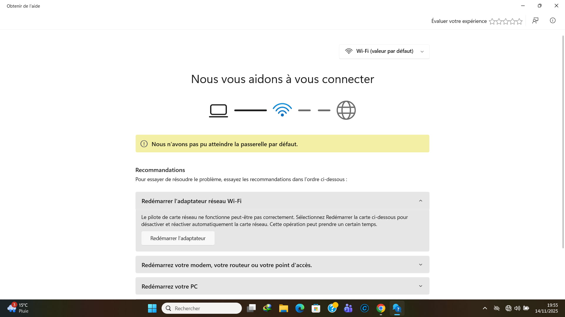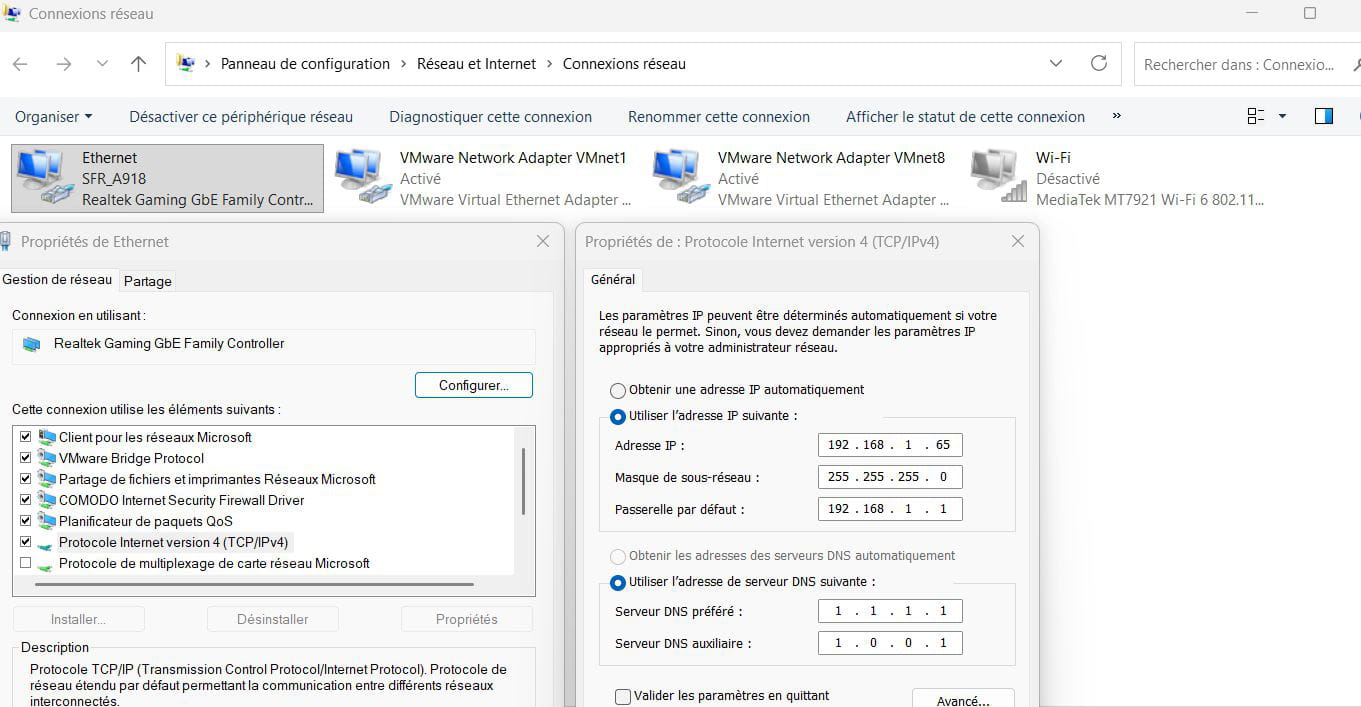 Je suis sous Windows 11 impossible de se connecter en wifi à ma Freebox, avec un câble ethernet j' arrive à me connecter a Internet sans problème,le problème ne semble pas venir de ma box car avec mon smartphone connecté en wifi cela fonctionne. Apparemment un problème de passerelle,mais je ne sais résoudre ce problème merci de votre aide