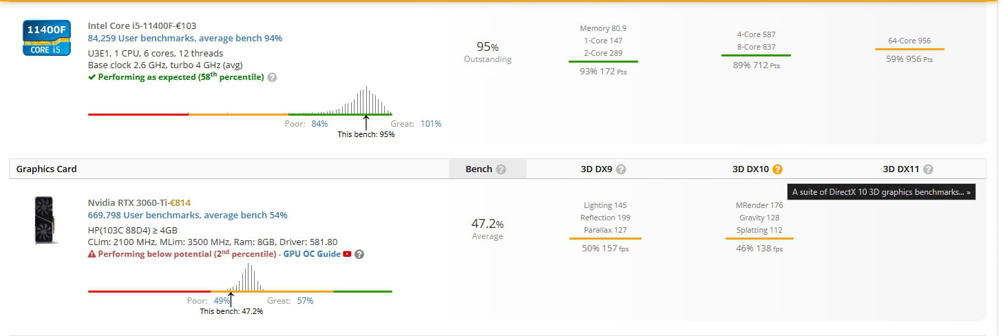 Les benchmarks en question t'as une "vieille" carte graphique pour eux il lui manque 2 générations c'est du 5xxx pas du 3xxx pour monter plus haut en consommant probablement moins. Mais le processeur aussi commence à avoir 4 générations en arrière même si ça se voit pas trop dans le résultat présenté il est "vieux" parce qu'il n'a que 6 cœurs physiques, 12 logiques si le programme veut bien s'en servir, il est à 60% en multicore ce bench dit donc aussi que ton processeur est bon pour le musée.