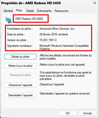 Je suis allé sur le site AMD Radeon afin de vérifier les MAJ, j'ai essayé de réinstaller la dernière version de cette carte graphique et j'ai aperçu un message disant "Impossible de charger le pilote de détection AMD Radeon HD5450......Veuillez contacter AMD ........quelque chose dans ce genre....