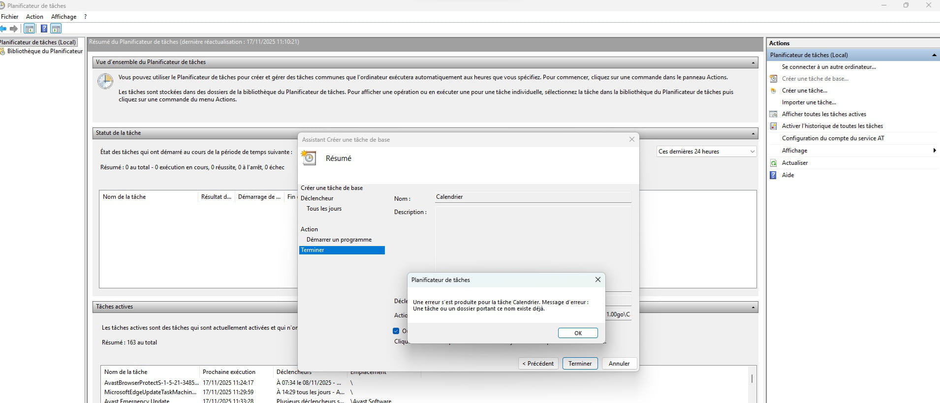 sur mon nouveau pc je veux creer une tache planifiées qui était géniale. en gros ouvrir le logiciel calendrier de windows tous les jours à partir de 05h30, seul hic il me dit que la tache existe déjà mais je ne la trouve pas ? et si c'est le cas elle ne marche pas, savez vous dans quoi il faut aller svp ?