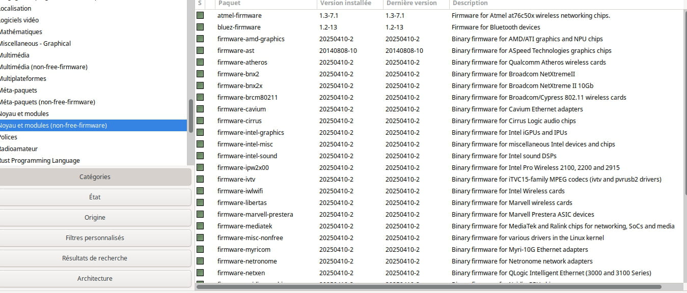 Remarque : Si les paquets "firmware-..." n'apparaissent pas avec , c'est sûrement que tu as oublié de configurer les dépôts non-free, contrib, non-free-firmware.