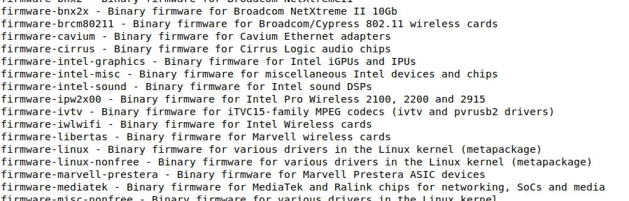 $ apt-cache search firmware | grep ^firmware- | grep -i Intel firmware-intel-graphics - Binary firmware for Intel iGPUs and IPUs firmware-intel-misc - Binary firmware for miscellaneous Intel devices and chips firmware-intel-sound - Binary firmware for Intel sound DSPs firmware-ipw2x00 - Binary firmware for Intel Pro Wireless 2100, 2200 and 2915 firmware-iwlwifi - Binary firmware for Intel Wireless cards firmware-netxen - Binary firmware for QLogic Intelligent Ethernet (3000 and 3100 Series) firmware-sof-signed - Intel SOF firmware - signed