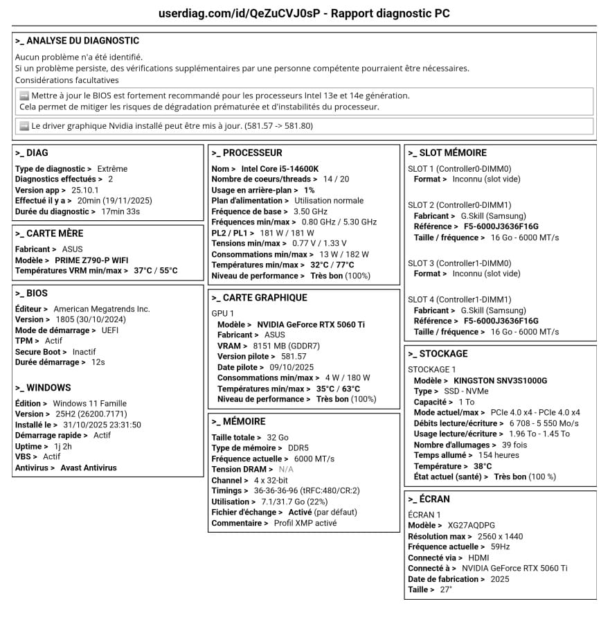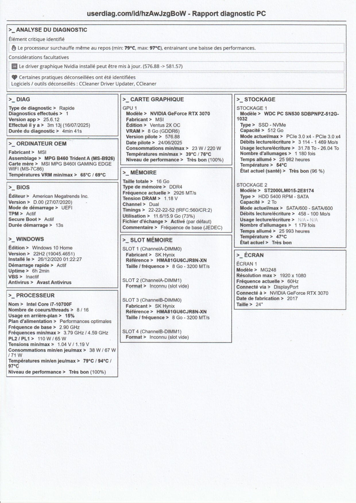 Mon résumé : ton userdiag est clean, peu en présentent avec de telles perfs. Ma propre tour s'en sortira pas avec de tels honneurs pour sûr. Donc si les perfs ne sont pas celles espérées, il faut soit jouer avec les paramètres graphiques, soit changer la CG et l'alim. Pour le reste, le travail réalisé est bon.