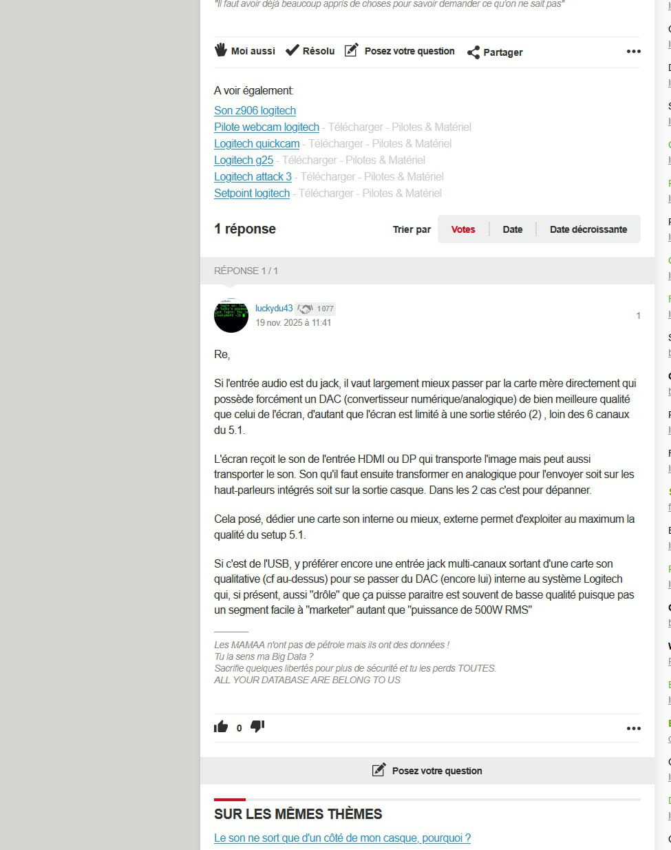 ps: j'en profite pour te demander un truc car tu touches vraiment "ta bille" j'ai acheté le son Z906 de lOgitech pour remplacer mon cambrige soundworks, je peux à la fois le brancher sur mon nouvel écran ou à la fois en direct sur le pc, me conseilles tu stp un endroit plus qu'un autre ou peu importe écran ou pc...?