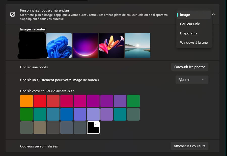 Je n'arrive plus a le remettre, la personnalisation de l'arriere plan, prend image, window a la une, couleur unie, mais ne veux pas garder diaporama.