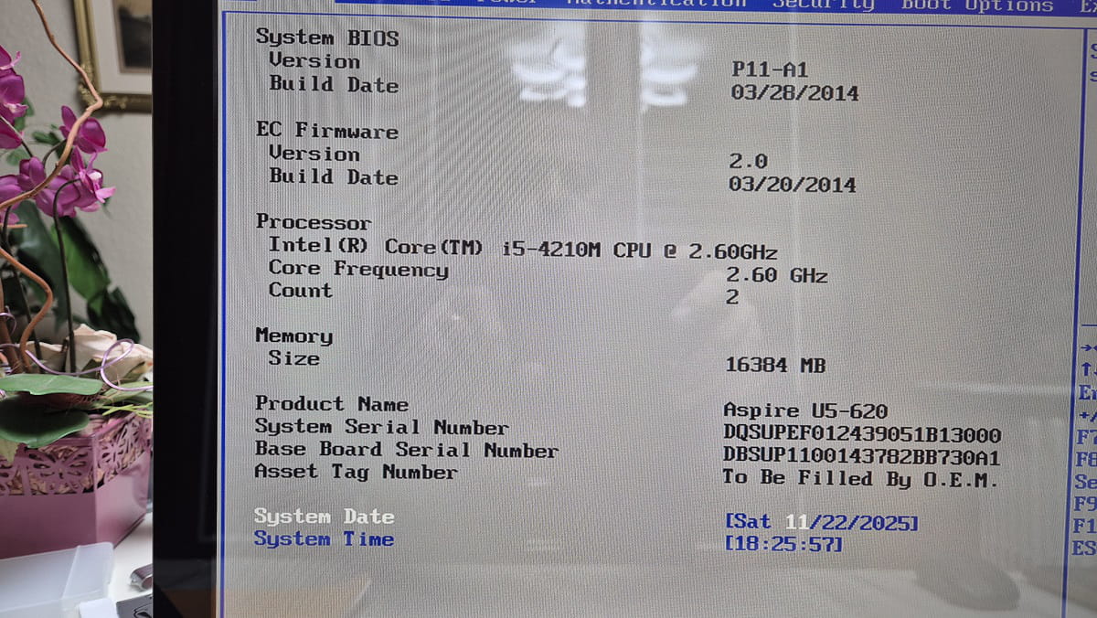 Le BIOS est très ancien et je n'ai pas trouvé chez Acer la possibilité de l'upgrader.