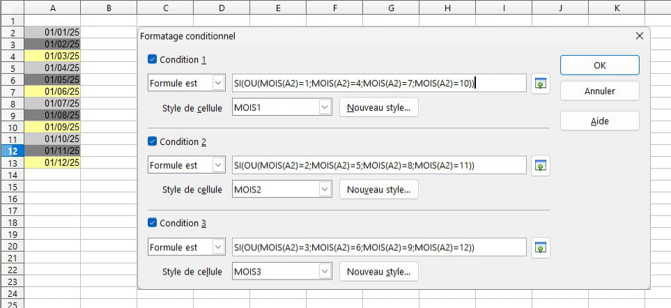 - -1 pour faire démarrer la première couleur au premier mois, purement esthétique. Pour simplifier, enlevez le -1 des formules mais la 1ère règle sera alors le = 1 quand la 3ème sera le = 0.
