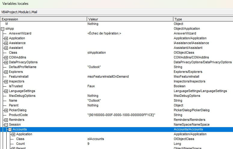 Dim M As Object, olApp As Object, oAccount As Object