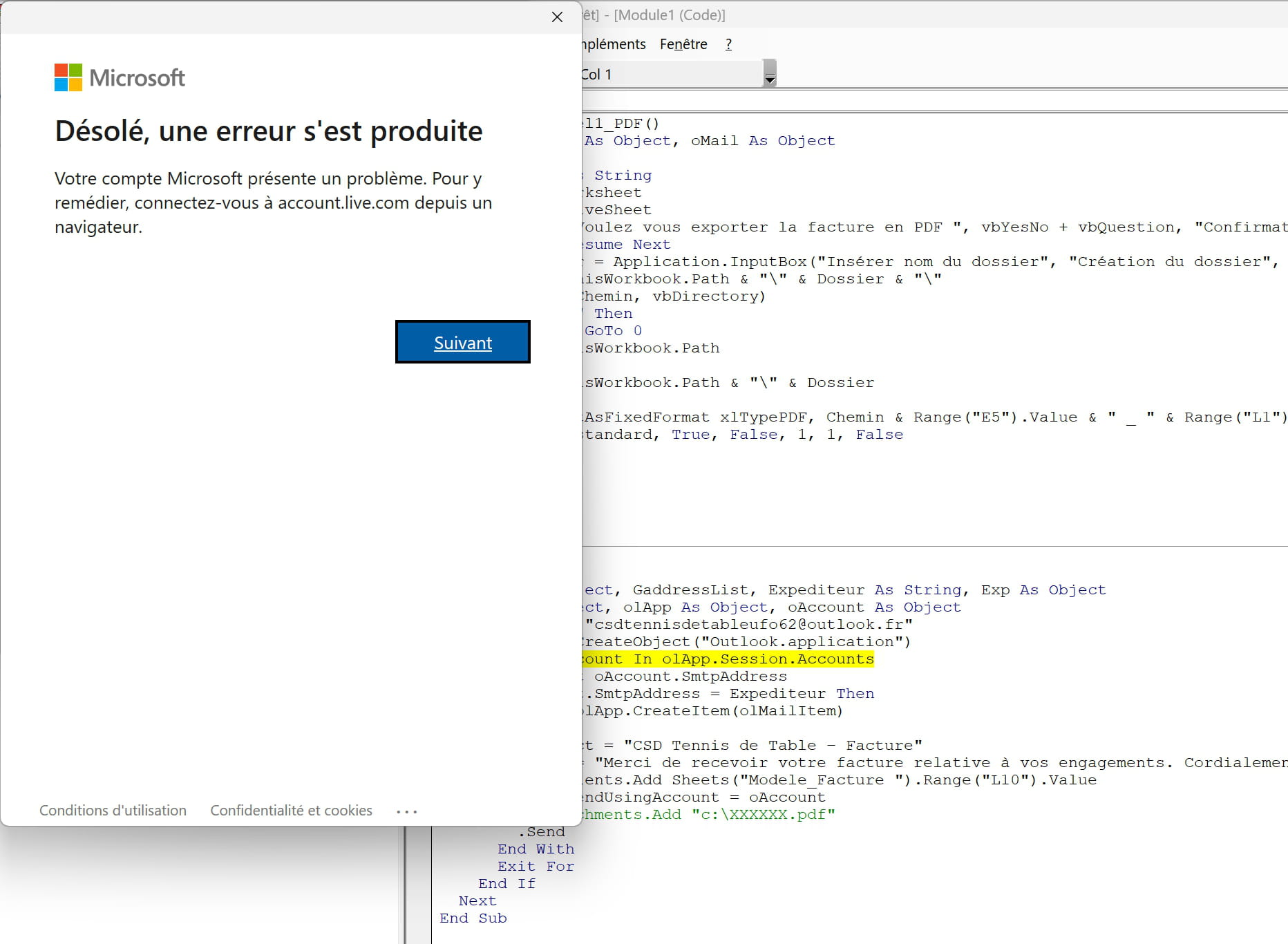 Tu ne vois rien d'anormal concernant ton abonnement à Microsoft 365 ? Sinon, Ouvre le classeur dans Excel. Appuie sur les touches Alt+F11. La fenêtre de l'éditeur VB s'ouvre. Clique dans la macro Mail.Appuie sur F8 pour exécuter la macro ligne par ligne. Recommence jusqu'à arriver à une erreur ou à la fin de la macro. Est-ce qu'il y a une erreur ?