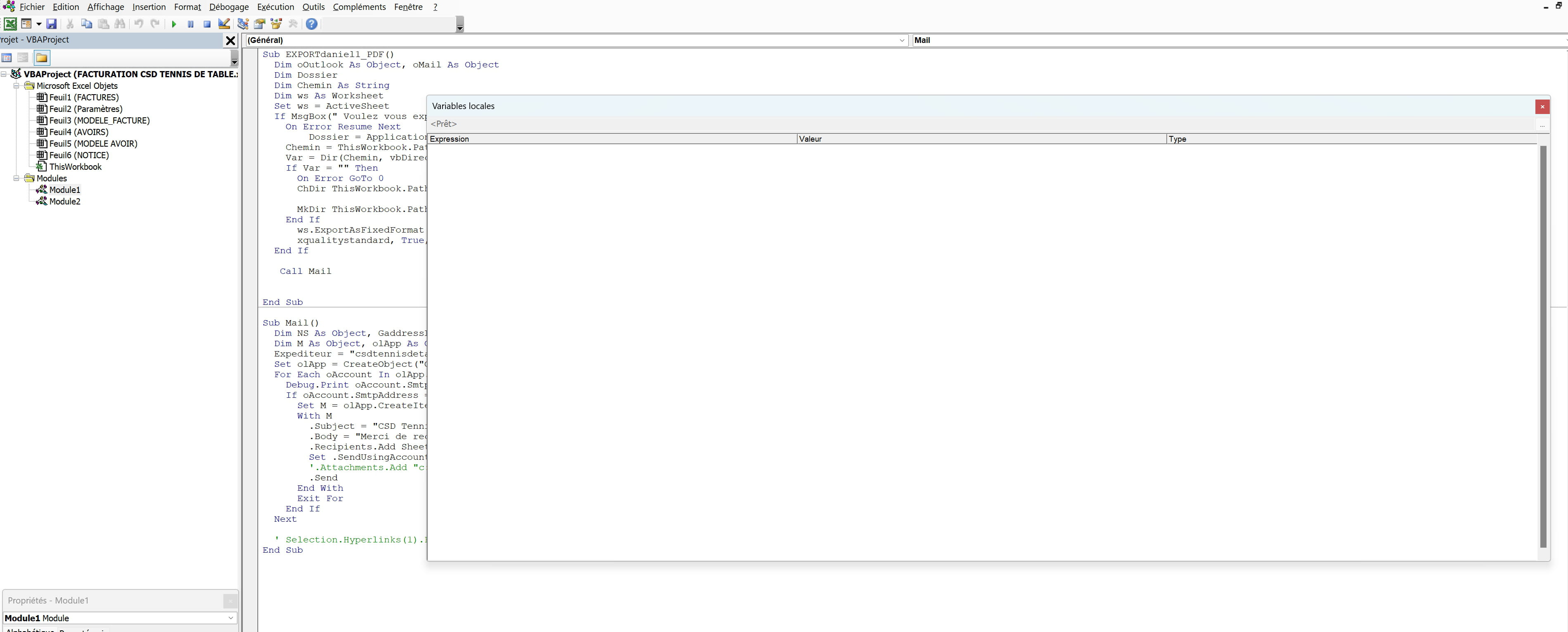 Le problème porte sur l’export d’une facture Excel en PDF avec création d’un dossier et nom de fichier calculé à partir des cellules E5 et L1, le tout dans un répertoire Finance sur OneDrive, mais le code actuel échoue. La solution la plus pertinente propose de déclarer Dossier comme chaîne, de construire le chemin avec des backslashes, de tester/créer le dossier via Dir et MkDir, puis d’exporter le PDF en utilisant le chemin complet et le nom fichier provenant de E5 et L1. Cette approche corrige l’erreur où Dossier était traité comme booléen et évite les séparateurs inadaptés dans le chemin. Des éléments évoquent que le stockage sur OneDrive ou Dropbox peut influencer le chemin d’accès et que des vérifications avec ThisWorkbook.Path ou des tests supplémentaires peuvent aider à diagnostiquer le chemin réel.