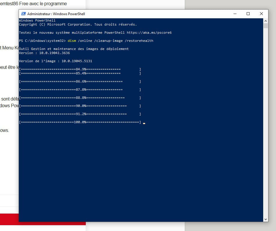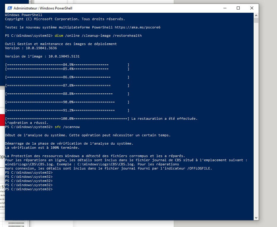 Sinon pour tenter de réparer Windows si des fichiers sont défaillants, par clic droit sur le bouton démarrer, utilisez cette commande avec Windows PowerShell (Terminal Admin)