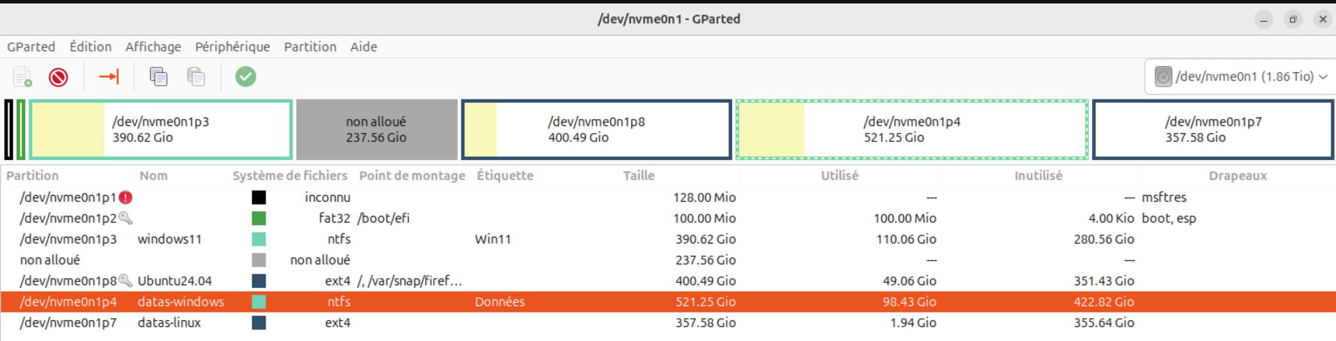 La partition nvme0n1p3 (déclarée comme “Windows11”) est en réalité formatée en NTFS mais maintenant renseignée comme “Linux filesystem” dans la table GPT.