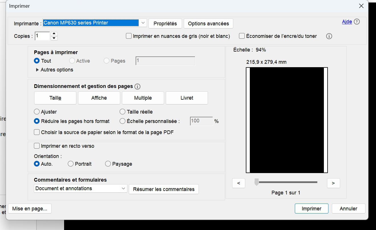 Depuis environ 1 semaine, tous les pdf que je veux imprimer sont automatiquement imprimés sur une zone de 215,9mm sur 279,4mm (c'est d'ailleurs indiqué sur la droite sur l'aperçu visible dans la boîte de dialogue). Le format papier est bien A4 21*29,7, le format page aussi, le document aussi. J'ai essayé avec d'autres document mais le résultat est le même...J'ai eu beau chercher partout autant dans les paramètres du PDF que dans ceux de mon imprimante rien n'y fait, je n'arrive pas à changer ce paramètre. Je me retrouve bien embêtée car je dois imprimer des documents professionnels (étiquettes pour ventes de produits) et l'impression est impossible, ce qui est imprimé se retrouve complètement décalé avec une marge énorme en haut et en bas...Si quelqu'un a une solution ça serait super! merci