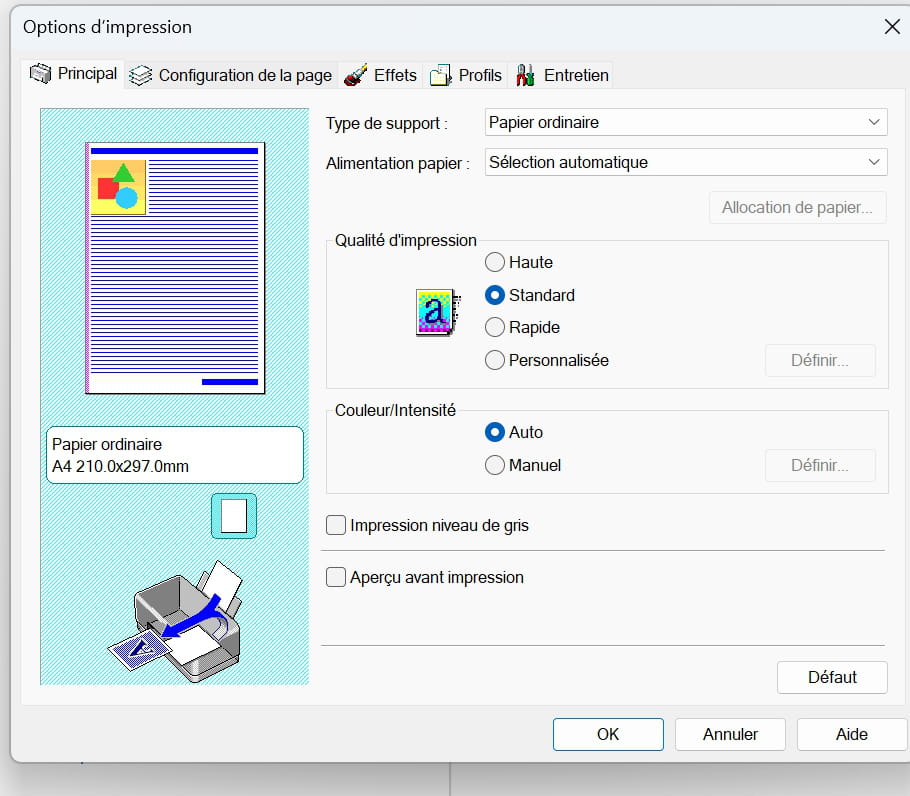 Si je vais dans propriétés, je n'ai pas Avancé....j'ai Principal et le format papier est en A4