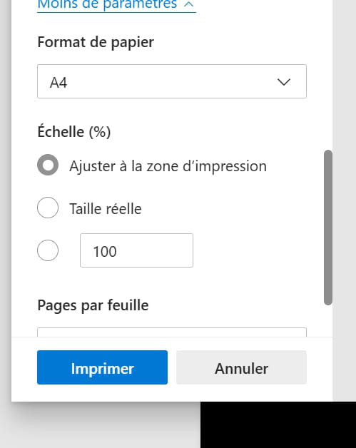 Bon j'ai créer un pdf format A4 entièrement noir et ouvert ensuite avec Edge. L'impression donne à peu de chose près la même chose c'est à dire qu'il y a bien des marges blanches sur les côtés, surtout en haut et en bas. Par contre en imprimant comme ça je ne tombe pas sur les mêmes fonctionnalités
