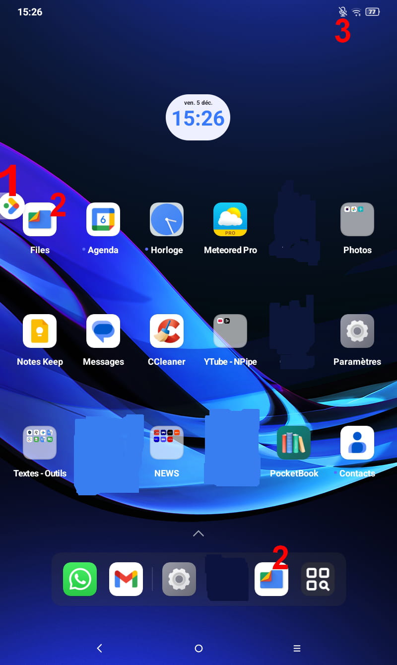 2. Lorsque j'ouvre une application sur le bureau cette derniere apparait egalement dans la barre de taches en bas [2], ce que je ne veux pas. Dans la barre de taches, je ne veux que GMAIL, Chrome et Whatsapp et parametres [en doublon sur le bureau]. Comment faire ?