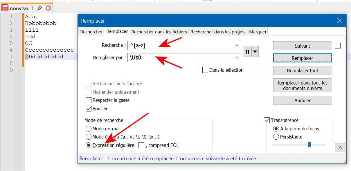 - "Remplacer par" se charge de remplacer ce "groupe 1" en Majuscule.