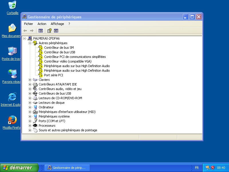 J'allume pour vérifier qu'il démarre bien sous Ubuntu puis j'installe XP (Pro SP3), la machine démarre bien et fonctionne basiquement mais m'affiche 7 périphériques en défaut, soit je la retourne soit on essaie de trouver les pilotes, vérification faite, elle n'est prévue que pour Windows 7 et plus.