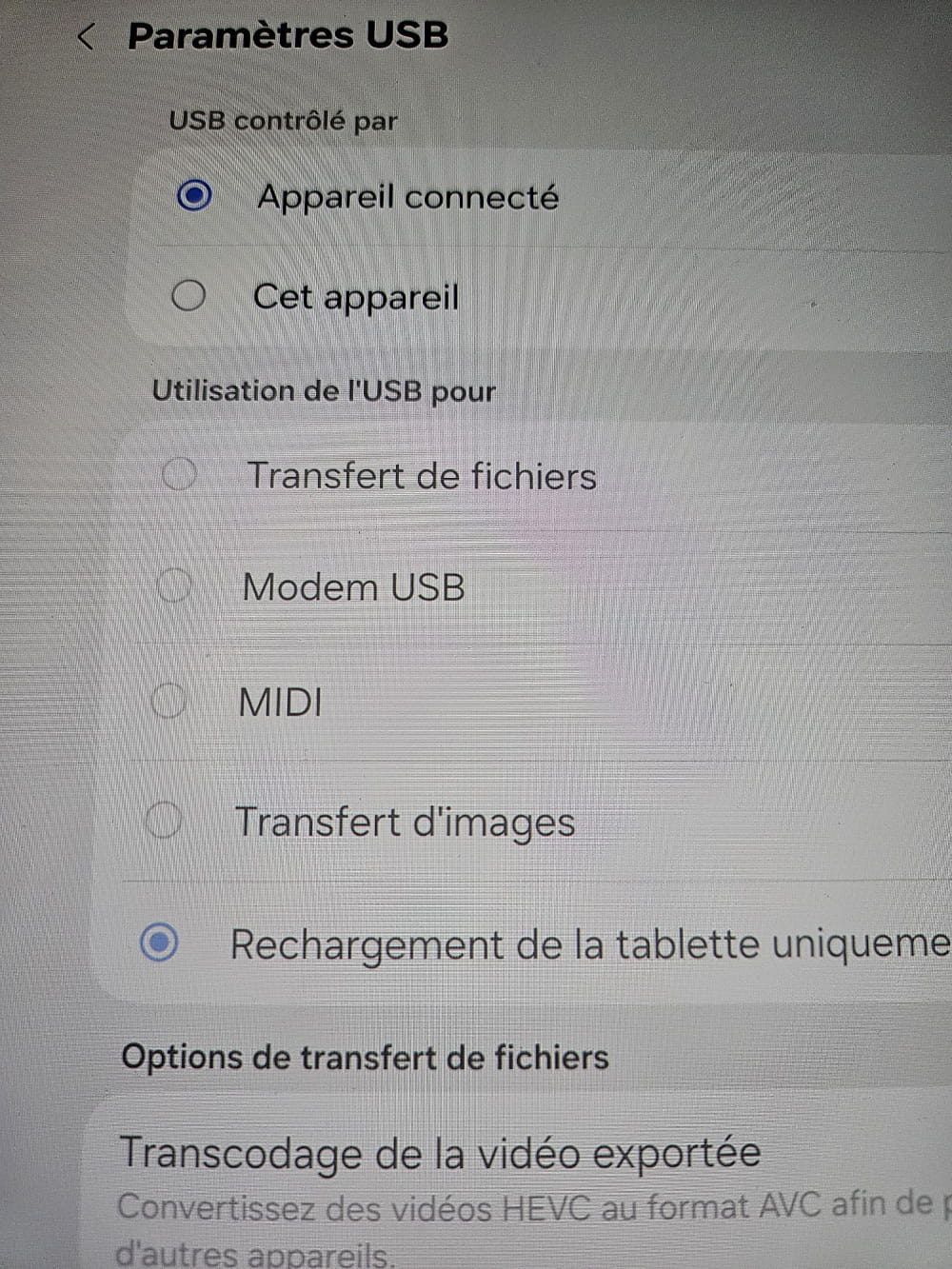 Cependant, si tu n'arrives pas à sélectionner ces options, il est fort probable que ton câble USB soit câblé seulement pour la recharge.