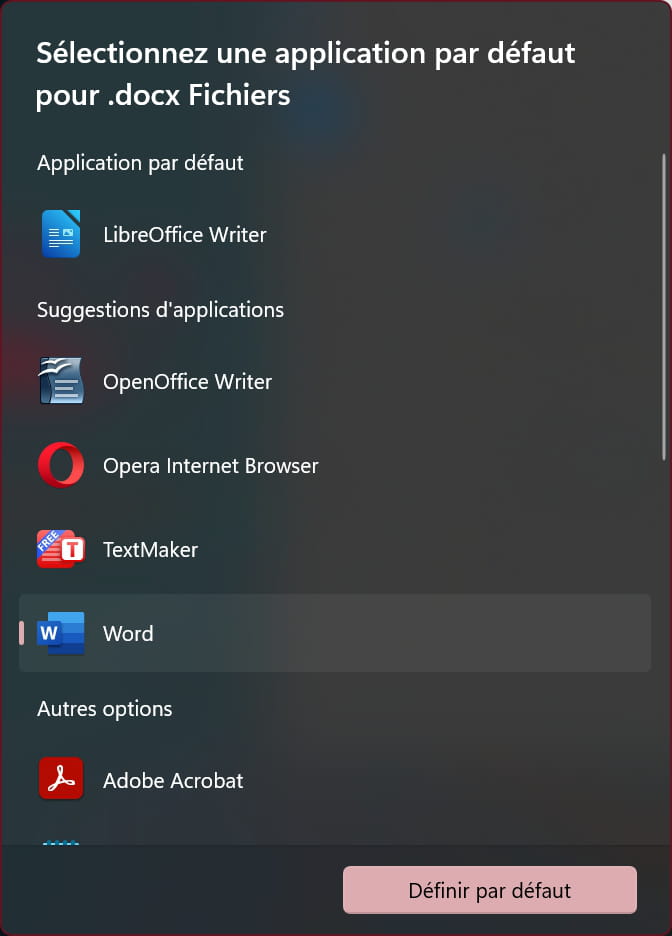 -Si je double clique dessus, il m'ouvre une fenêtre : "sélectionnez une application pour ouvrir ce fichier .docx