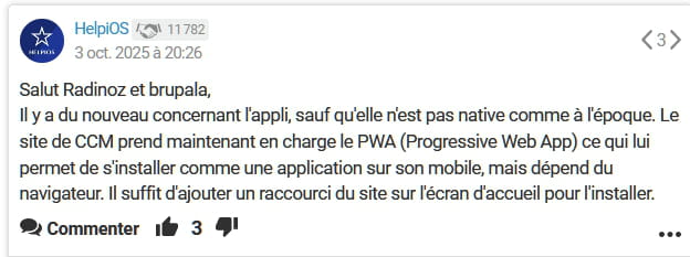Par contre, vous pouvez éventuellement vous mettre un raccourci direct sur votre téléphone visant le site internet de CCM ou son Forum.