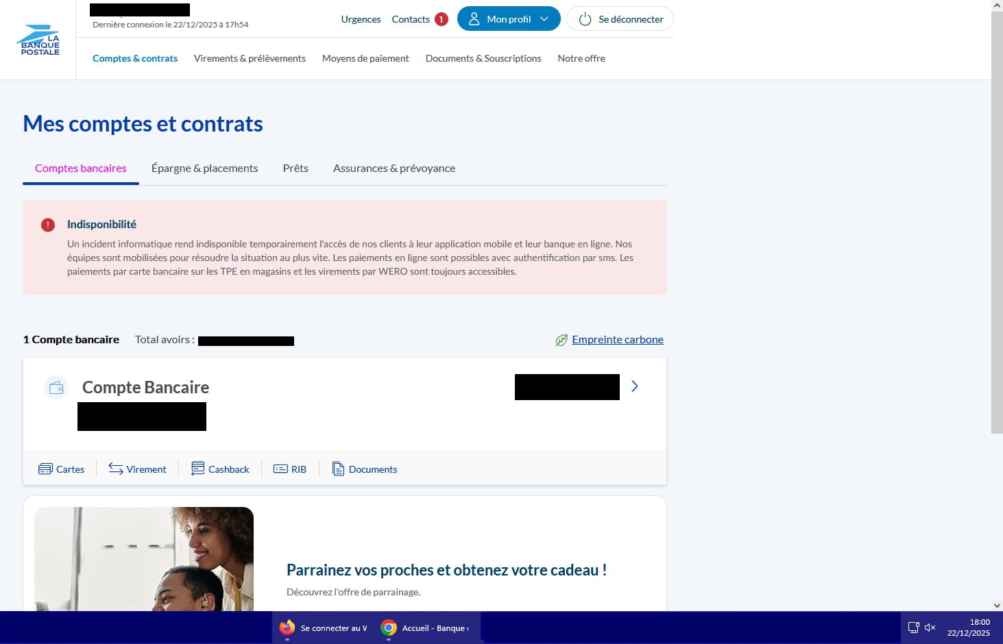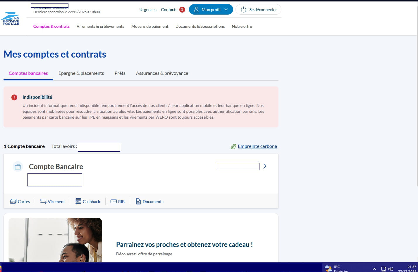 Ce même message est toujours présent une fois connecté et surtout connexion réparée (Banque postale,sur PC et Phone).